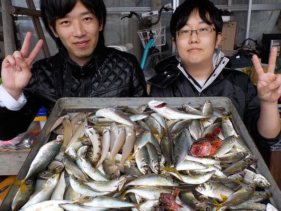 10月26日 磯釣りで塚本さん クロ5匹 サヨリ3匹 アジゴ15匹 ボラ1匹