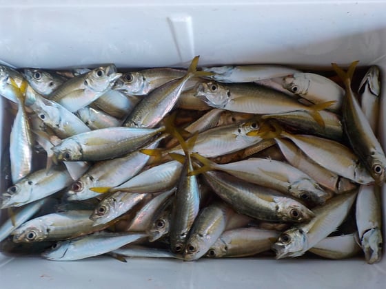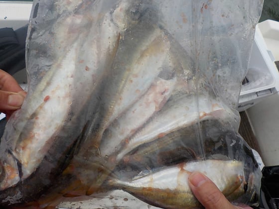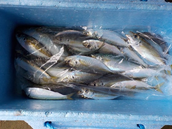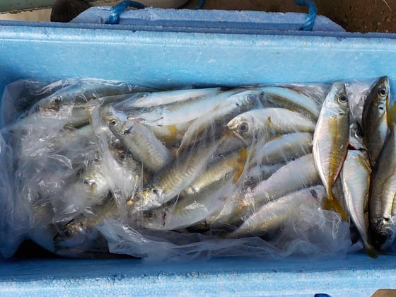 10月9日 ボート釣りで陣内さん アジ31匹 クーラーにクロ10匹 アジ50匹