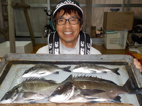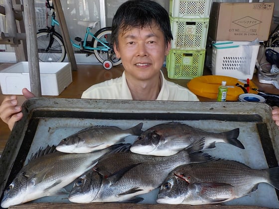 10月7日 ダゴチン釣りで森口さん チヌ43㎝を頭に4匹 タイ40㎝を頭に3匹